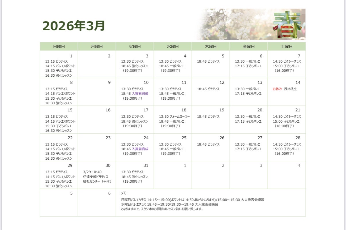 3月レッスンスケジュール